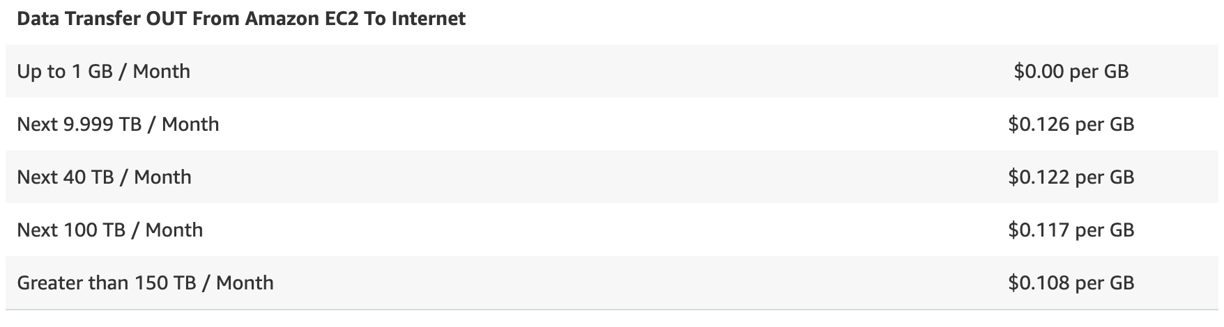 - Outbound 트래픽(인스턴스에서 나가는 트래픽)이 사용하는 모든 서비스합산 월 15GB 이하여야 한다(초과되면 요금부과). 아래는 프리티어가 아닐때의 요금이다.(변동성돌파 등 실시간 트레이딩의 경우 상당한 트래픽이 발생하긴한다)