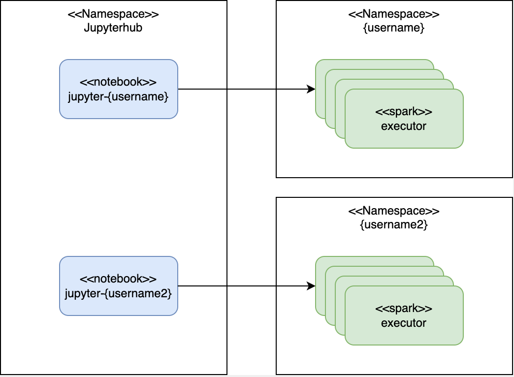 주피터 노트북이 driver 역할을 하며, 기본적으로 노트북 driver 파드의 리소스는 고정되어 있다.(extraConfig을 활용하면 사용자별로 다르게 설정할 수 있기는하다)