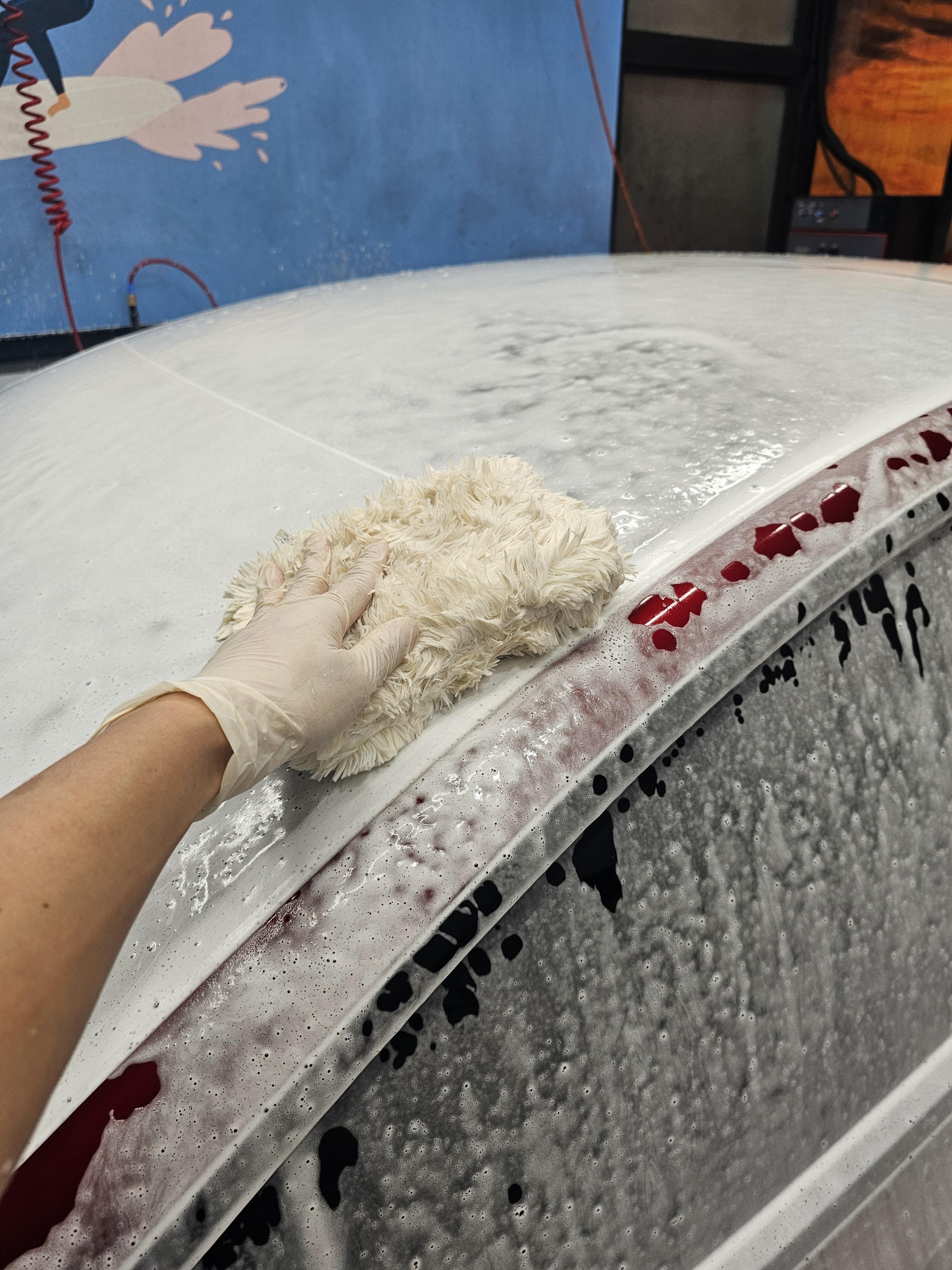 스노우폼이 있는 상태로 미트질을 하면 된다. 중간 중간에 미트를 뒤집어 주고, 버킷에 행구는 것을 잊지 말자.