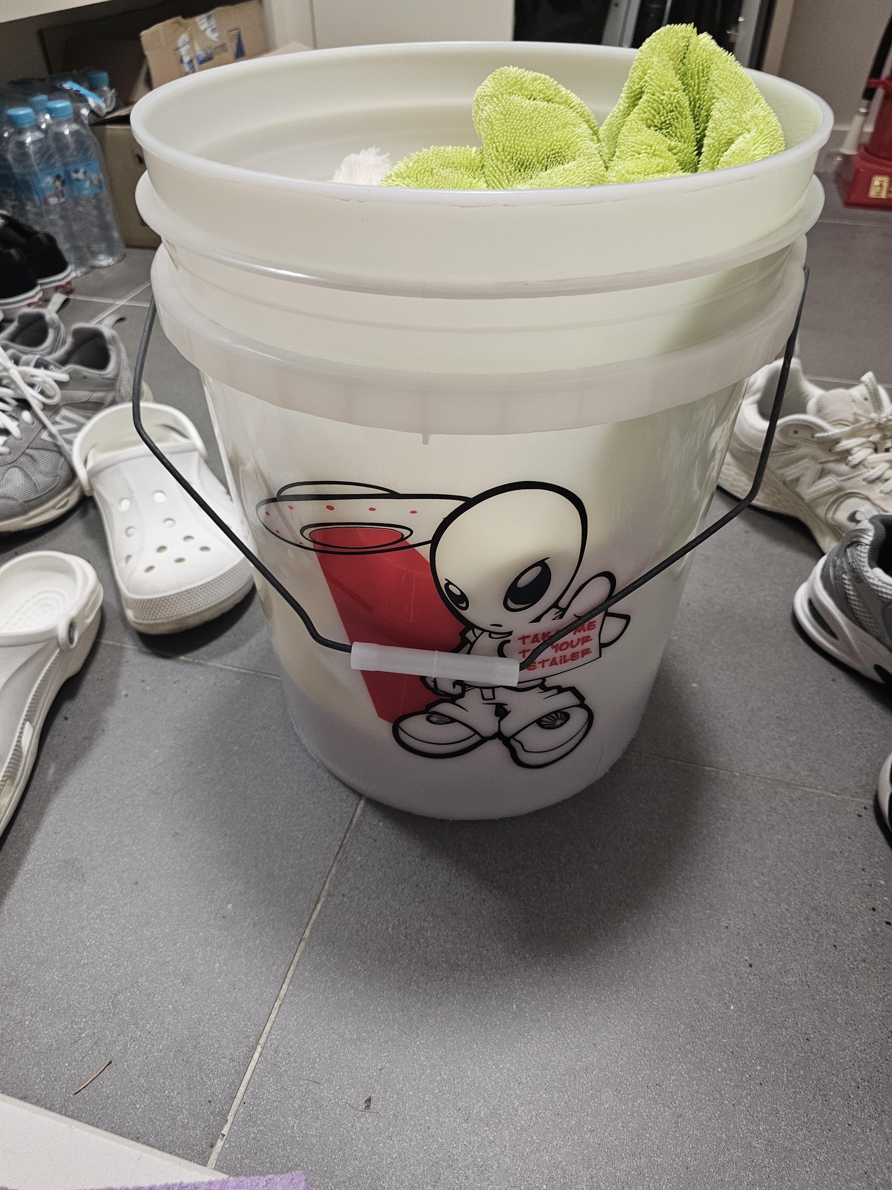 미트질을 하면서 주기적으로 이물질들을 미트에서 털어줘야 한다. 그래서 물통이 필요한데, 세차용 버킷을 하나 구매해두면 좋다. 보통 위 타월들을 버킷에다 넣어두고 보관하면 좋다. 둘 공간이 없다면 접이식도 있으니 인터넷에서 검색해보기 바란다.